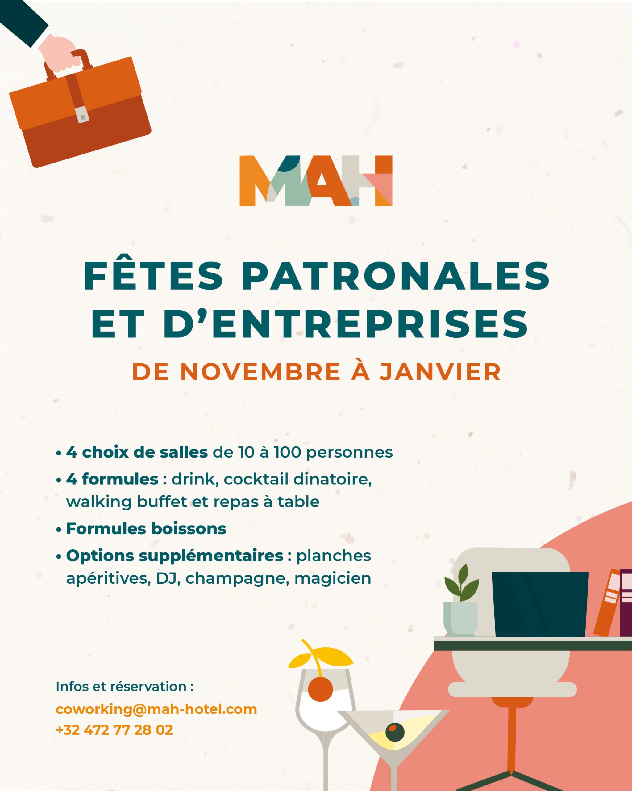 BOOK WORKSPACE BOOK TABLE BOOK ROOM Je contacte MAH Prochains Évènementsau MAH : HOTEL___ MAH.somni RESTAURANT___ MAH.sense BAR___ MAH.felise COWORKING___ MAH.gran Rue de la Verrerie, 57330 Saint-GhislainBelgique Parking voiture / vélo / moto disponible #mahhotel +32 65 70 70 50 hello@mah-hotel.com Commentréserver ? Je réserve en ligne J'envoie un email Je réserve par téléphone SuivreSuivreSuivre Mentions légales - Conditions d’utilisation - Charte Vie Privée - Conditions générales MAH © SCALIM Book room Book table Book workspace